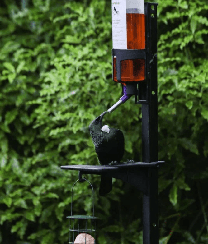 This feeding station by Peka Peka provides the perfect place for this Tui to enjoy a drink of sugar water.