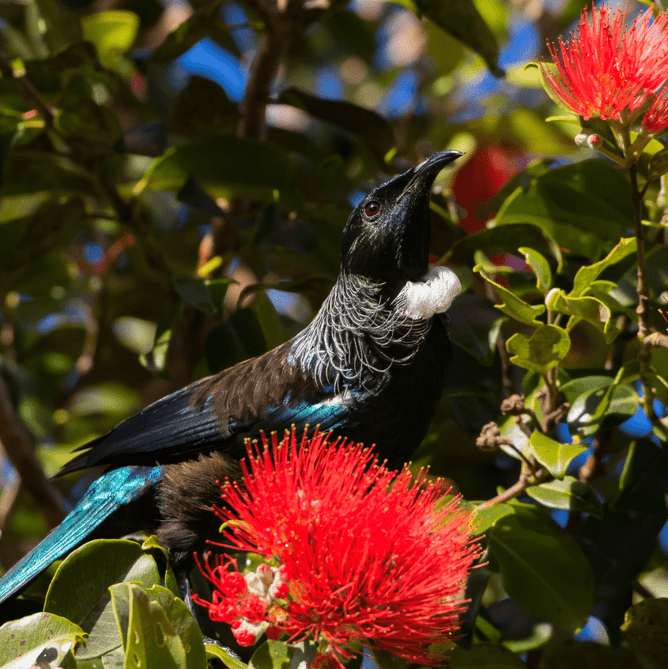 Our native birds, such as the Tui, feed on nectar from our native plants, pollinating flowering plants and dispersing the seeds of trees.