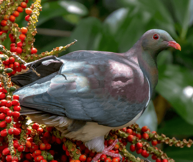 A kererū, or New Zealand pigeon, feeds on the berries of a Nīkau palm.
