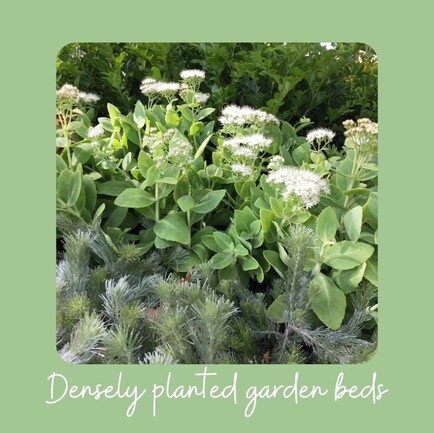 Opt for large garden beds rather than small ones. A densely planted garden bed filled with a tightly knit matrix of plants requires little grooming and pruning to control its size. Know how large each plant is going to grow so you can space the plants accordingly.